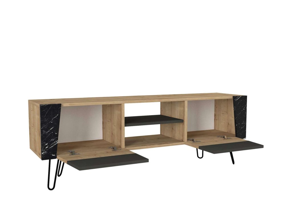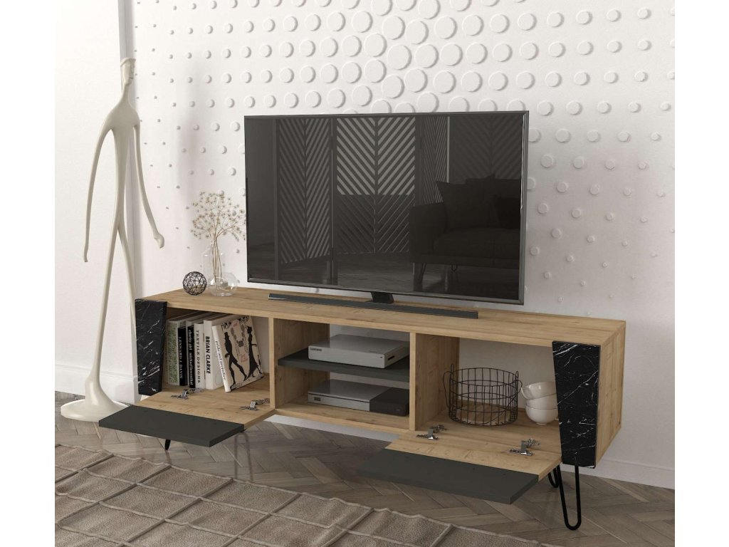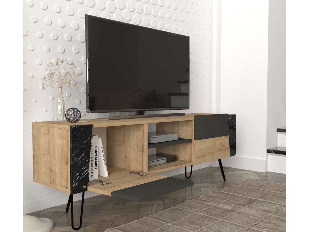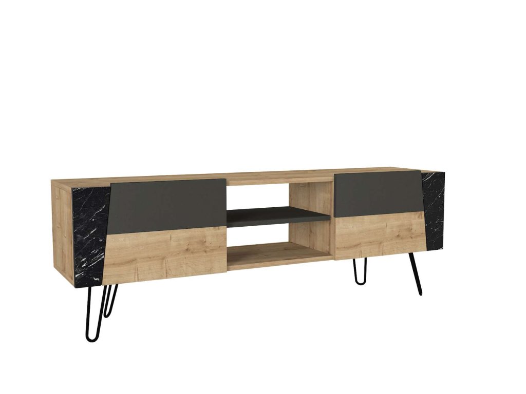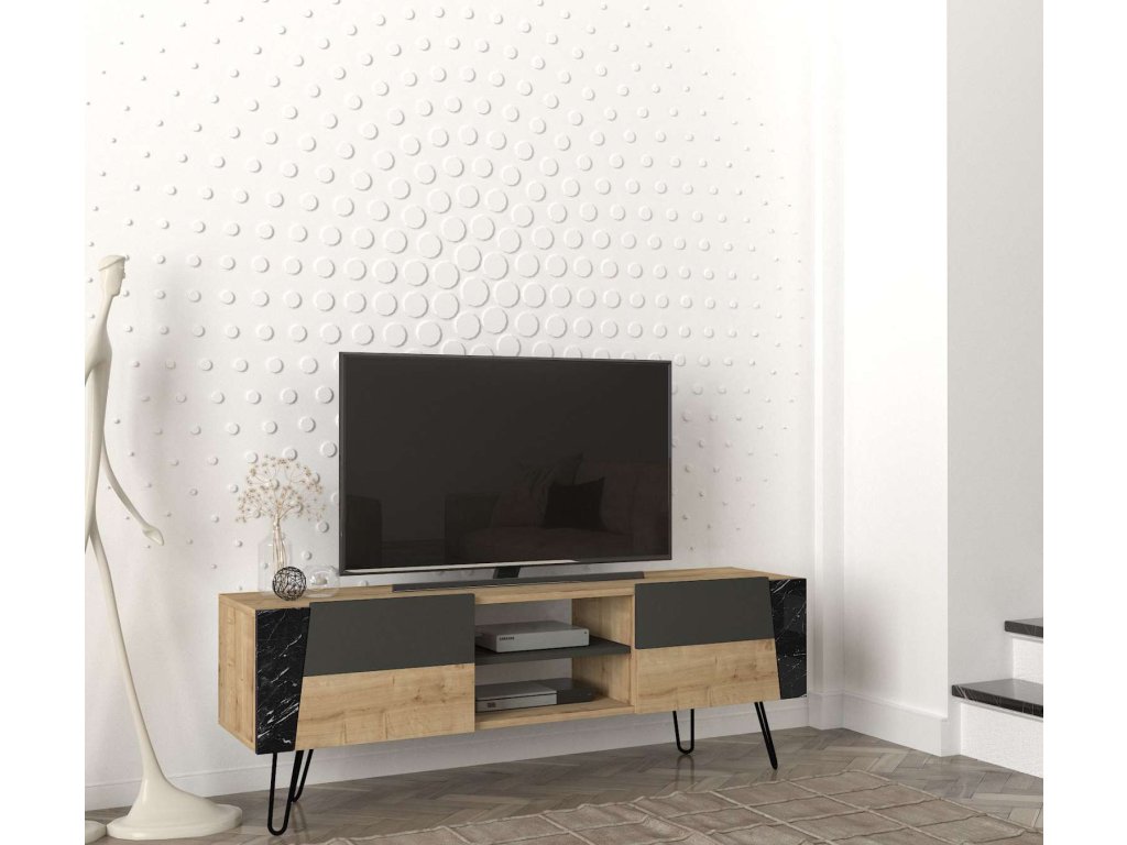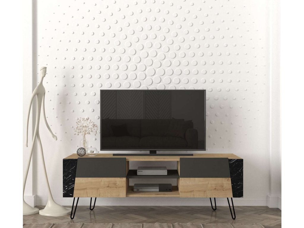 Objavte FANTOM, TV stolík, ktorý elegantne kombinuje svetlo hnedú farbu s akcentmi mramoru a antracitu. Tento moderný kus nábytku nie je len praktický, ale aj esteticky príťažlivý, ideálny na oživenie každej obývačky.