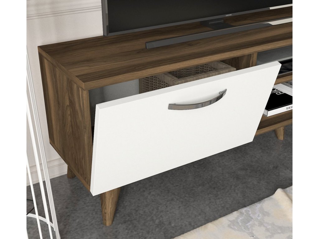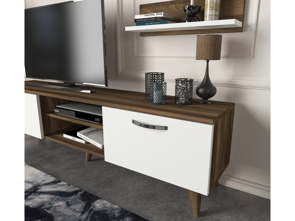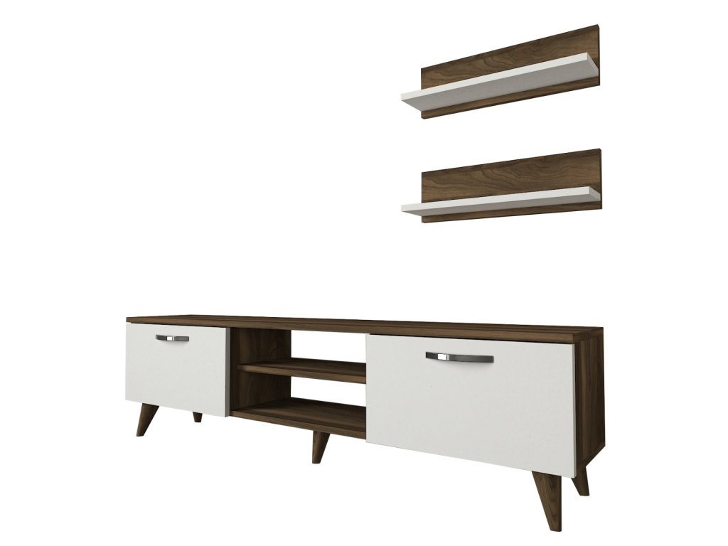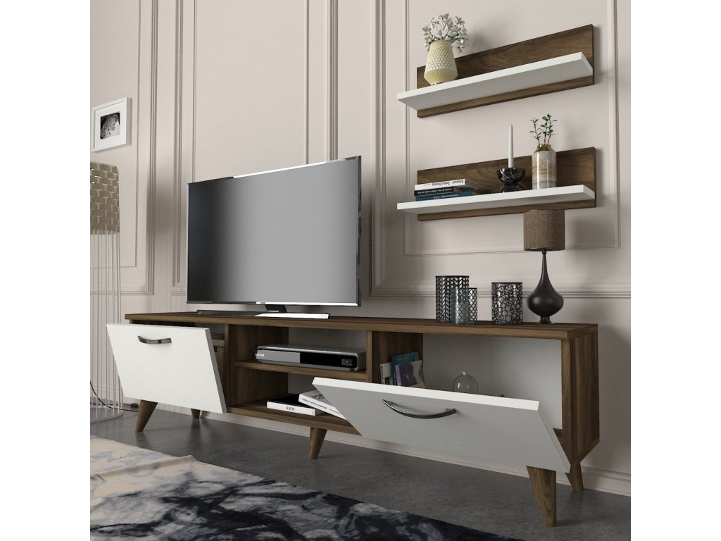 Jednoduchý TV stolík DENAY sa vďaka svojim rozmerom skvele hodí do malých interiérov. TV stolík má v cene aj praktické nástenné police, ktoré výborne poslúžia na odloženie kníh či dekorácií. Stolík obsahuje okrem otvorenej časti aj praktické výklopné skrinky, do ktorých uschováte všetko, čo potrebujete odložiť.