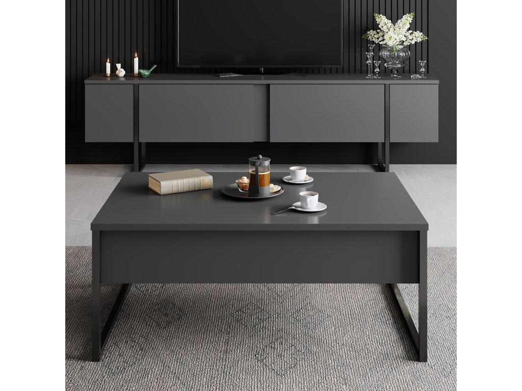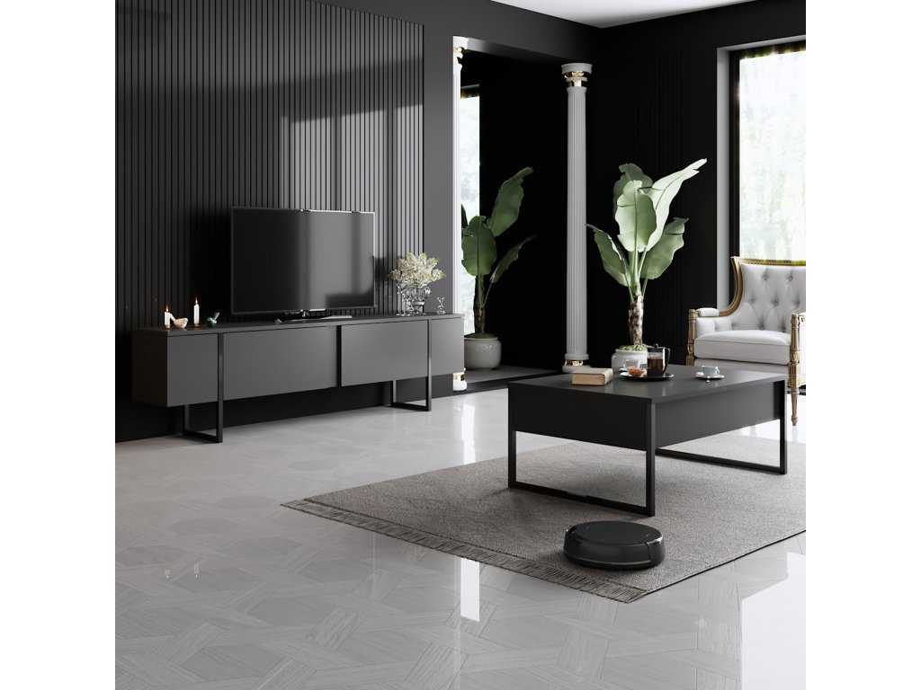 Tento televízny stolík je vyrobený zo 100% drevotriesky s melamínovým povlakom a ponúka bezkonkurenčnú odolnosť a dlhú životnosť. Hrúbka 18 mm zaisťuje robustnú a spoľahlivú konštrukciu, ktorá vydrží skúšku času. Jeho elegantný a moderný dizajn s kombináciou antracitovej a čiernej farby dodá každému obytnému priestoru nádych elegance. zábavných potrieb. Kovové nohy nielen dodávajú moderný nádych, ale tiež poskytujú vynikajúcu stabilitu a oporu.