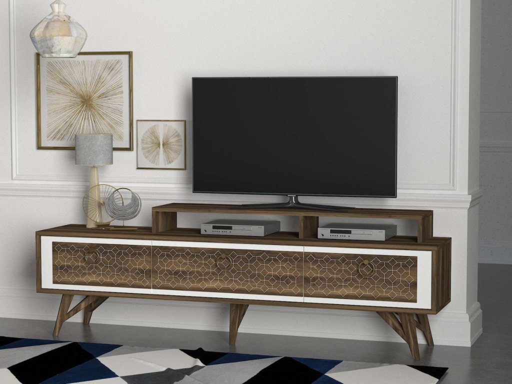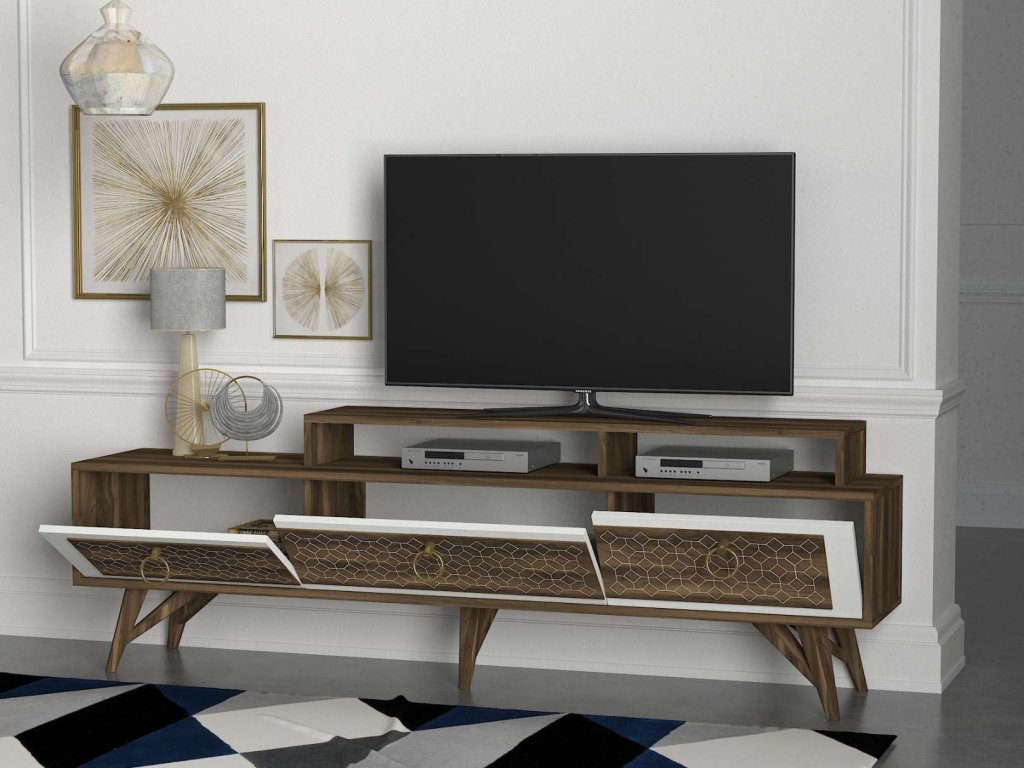 Predstavujeme TORO, TV stolík, ktorý prináša do vašej obývačky eleganciu a moderný dizajn s orientálnym nádychom. Tento štýlový nábytok v kombinácii bielej a orechovej farby je navrhnutý tak, aby poskytoval praktické a estetické riešenie pre vaše multimediálne zariadenia a ďalšie potreby.