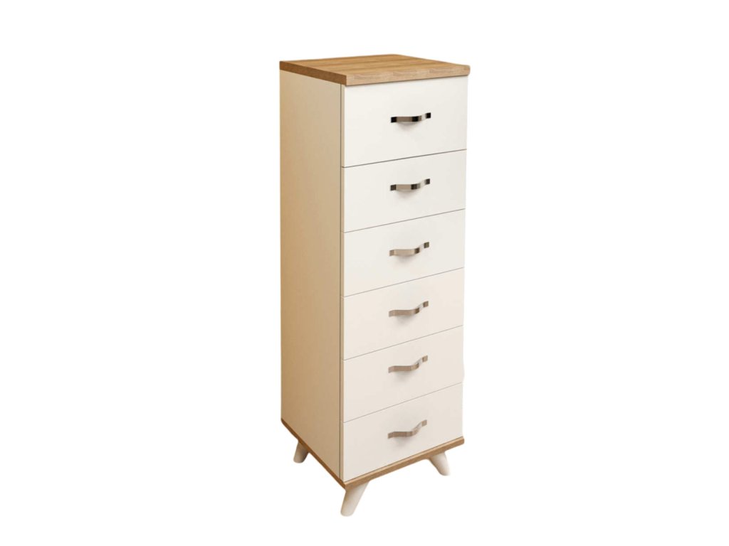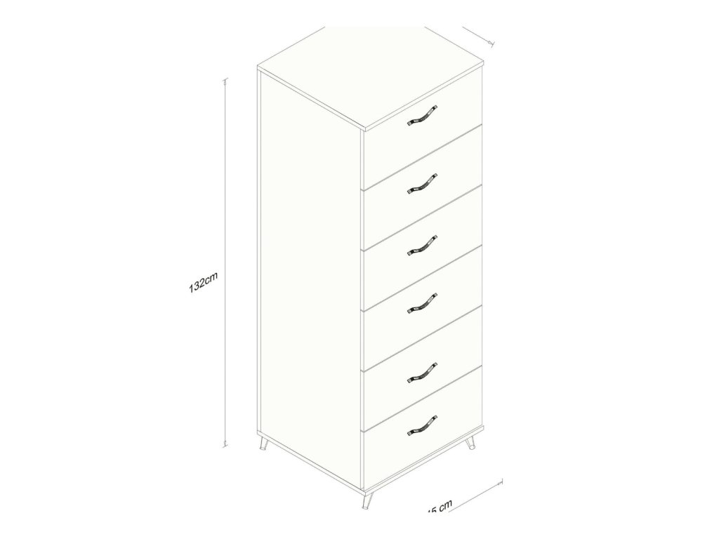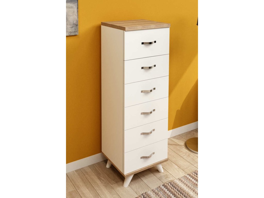 Komoda je vybavená 6 priestrannými šuplíkmi, ktoré poskytujú dostatok úložného priestoru pre vaše veci. Stojí na elegantných nožičkách, čo uľahčuje údržbu podlahy pod ňou. Vyrobená z kvalitnej drevotriesky potiahnutej melamínom, komoda CARLISLE zaručuje dlhú životnosť a odolnosť.