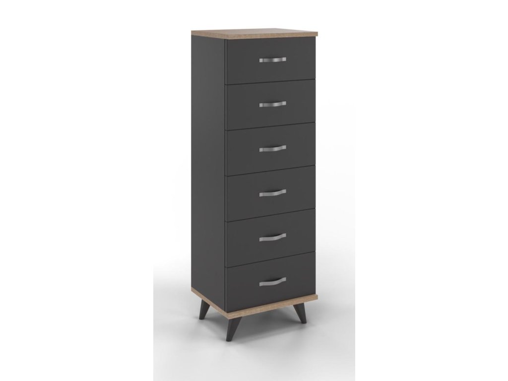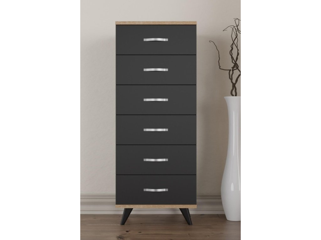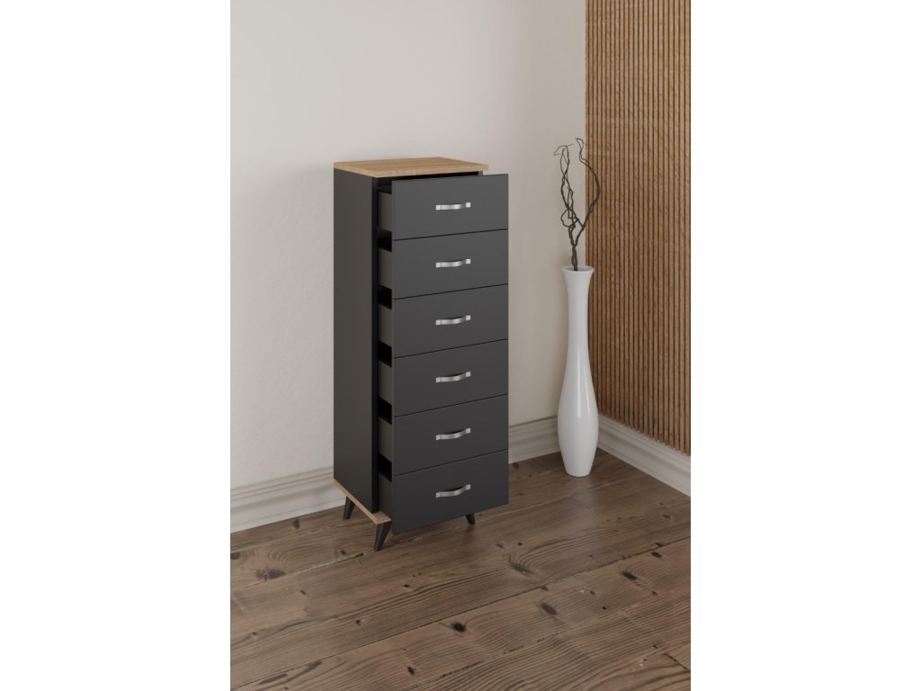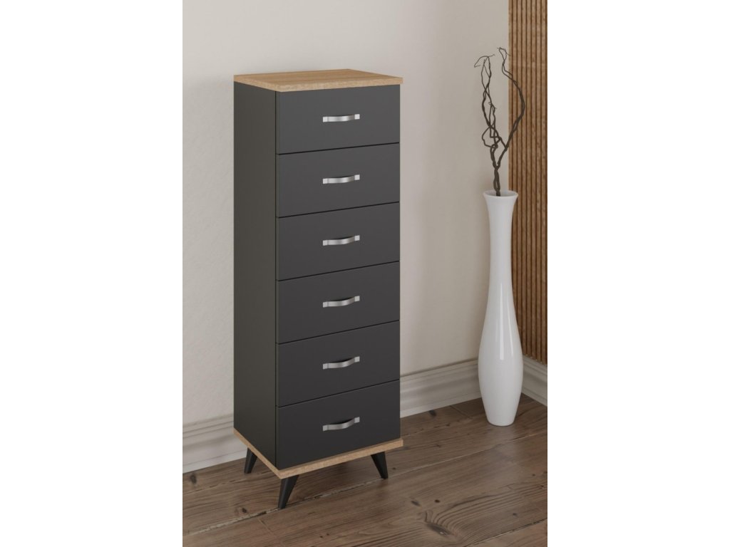 Predstavujeme vám úzkou komodu CARLISLE v elegantnej kombinácii dub Sonoma a antracit. Táto štýlová komoda prináša do vášho domova moderné a funkčné úložné riešenie.