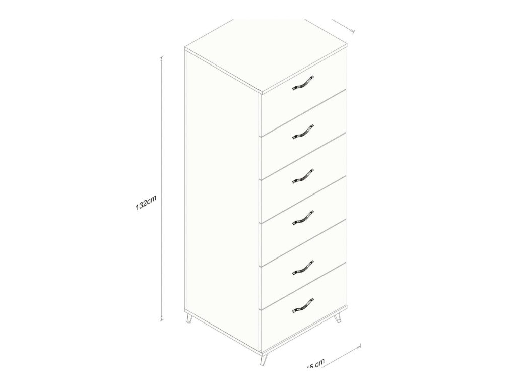 Komoda je vybavená 6 priestrannými šuplíkmi, ktoré poskytujú dostatok úložného priestoru pre vaše veci. Stojí na elegantných nožičkách, čo uľahčuje údržbu podlahy pod ňou. Vyrobená z kvalitnej drevotriesky potiahnutej melamínom, komoda CARLISLE zaisťuje dlhú životnosť a odolnosť.