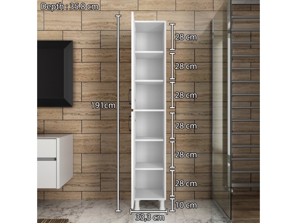 - Rozmery: 191 x 33,3 x 35,8 cm – úzky a vysoký dizajn pre maximálne využitie priestoru.