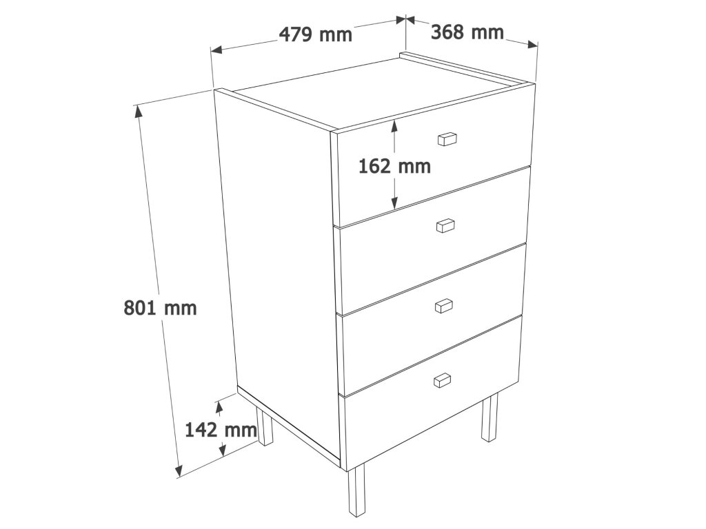 Komoda je vyrobená z kvalitného melamínu a VT laminátu, čo zabezpečuje pevnosť, stabilitu a jednoduchú údržbu. Disponuje 4 zásuvkami, ktoré poskytujú dostatok úložného priestoru na oblečenie, dokumenty či ďalšie doplnky, ktoré chcete mať prehľadne usporiadané.