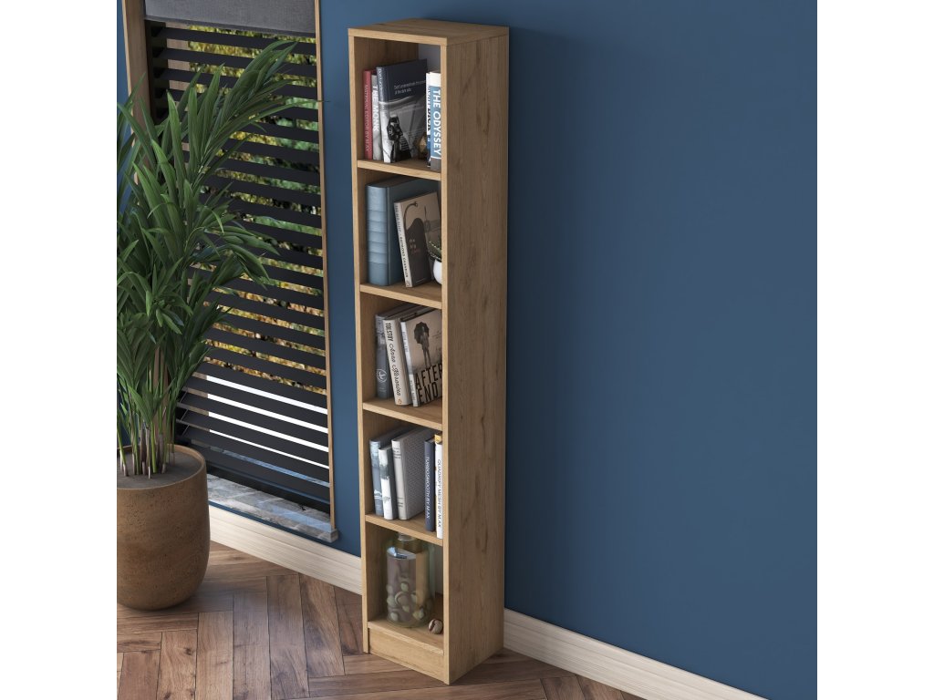 Knižnica INDIGO je štýlovým a funkčným doplnkom pre vašu obývaciu izbu. Jej úzky dizajn a dekor v odtieni orecha pridávajú interiéru moderný a sofistikovaný vzhľad. Vďaka štyrom policam ponúka dostatok priestoru pre knihy, dekorácie alebo iné drobnosti.