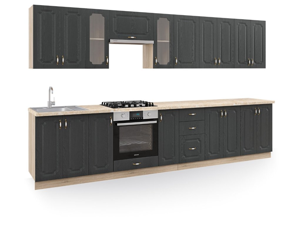 Kuchynská linka MADONNA 340 je veľkorysým a reprezentatívnym riešením pre priestranné kuchyne, v ktorých chcete spojiť vysokú funkčnosť s výrazným vintage a retro štýlom. Elegantná farebná kombinácia šedá + dub Sonoma pôsobí nadčasovo, útulne a dodáva kuchyni osobitý charakter s dôrazom na tradičný dizajn.