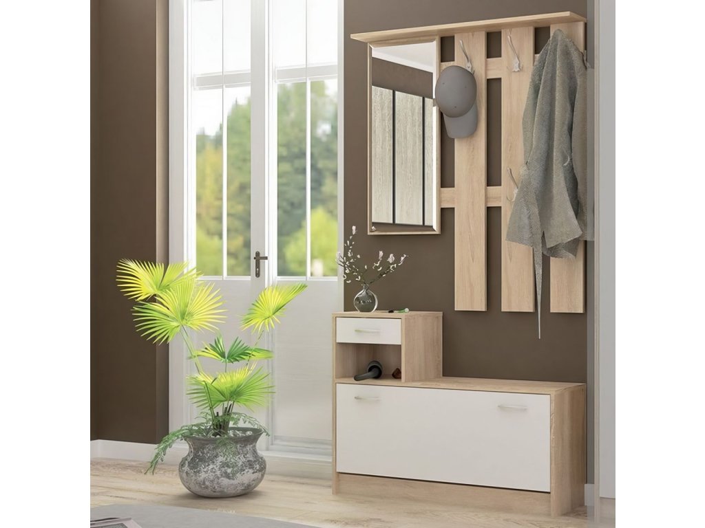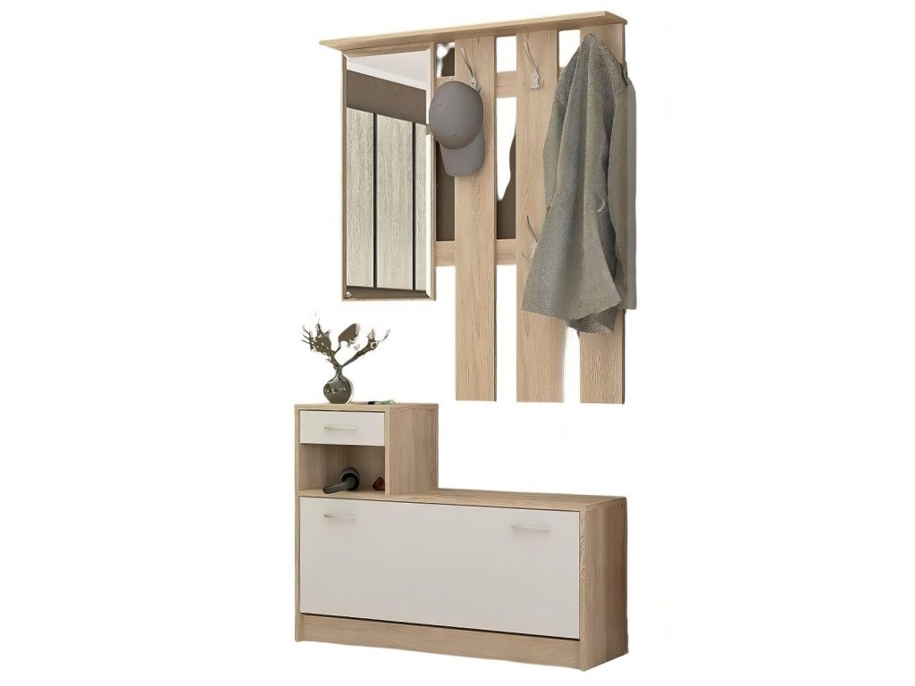 SAGITTA vešiaková zostava s botníkom je ideálna do malých vstupných priestorov. Vďaka jej rozmerom dokážete ideálne využiť aj malý priestor. Oceníte žiadané farebné prevedenie, kombináciu farieb aj cenovú dostupnosť. Zostava pozostáva z: - vešiakovej steny so zrkadlom a hornou poličkou - malého výklopného botníku, ktorého súčasťou je aj otvorená polička a výsuvný šuplík. Nábytok je vyrobený z lamino dosky, ktorá nie je náročná na údržbu. Farba: dub sonoma/biela. Rozmery (š/v/h): 99,8 x 187 x 27,5 cm. V rovnakom farebnom a dizajnovom prevedení ponúkame aj malú šatníkovú skriňu. Skombinujte si tieto dva produkty a vytvorte si štýlovú a cenovo dostupnú vstupnú halu. V našej ponuke nájdete aj rovnakú zostavu s pohodlným vankúšikom. Dodávame v demonte.Dodatočné parametre