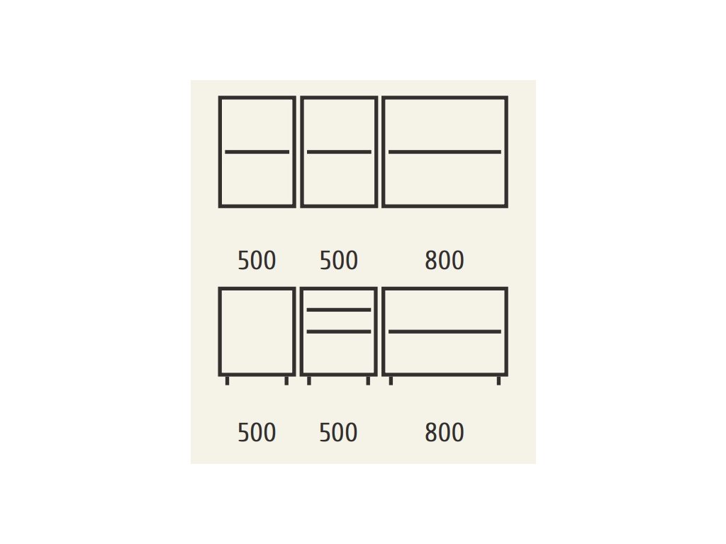 | Zostava obsahuje: | Horná skrinka 50 cm, horná skrinka 50 cm, horná skrinka 80 cm, dolná drezová skrinka 50 cm, dolná skrinka 50 cm, dolná skrinka 80 cm |