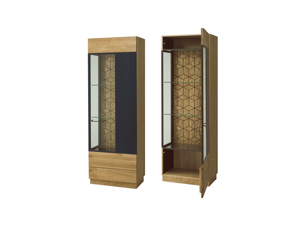 Vitrína MOZAIK vás zaujme svojim elegantným a zároveň luxusným prevedením. Je zo sektoru MOZAIK, vďaka ktorému si poskladáte vašu obývačku podľa predstáv. Je vyrobená z lešteného a olejovaného masívneho dreva. Farebné prevedenie: dub/čierna matná. Úchyty sú v čiernej matnej farbe, vyrobené z kovu. Vitrína je jednodverová. Vo vnútri sa nachádza 5 políc. Dvere vitríny sa otvárajú do pravej strany. V ponuke je aj vitrína s otváraním vľavo. LED osvetlenie nie je súčasťou. Je možné si ho dokúpiť (viď. doporučené produkty). Sektorový nábytok MOZAIK vám ponúka moderný dizajn a kvalitné prevedenie. Prírodná vôňa masívneho dreva a dlhá životnosť nábytku vás presvedčia, že nábytok MOZAIK je to najlepšie riešenie. Nábytok sa ľahko kombinuje s akýmkoľvek interiérom. Vďaka svojmu prevedeniu zútulní vašu obývaciu miestnosť. Výhodou nábytku MOZAIK je, že sa dodáva už zmontovaný. Záruka 24 mesiacov.Dodatočné parametre