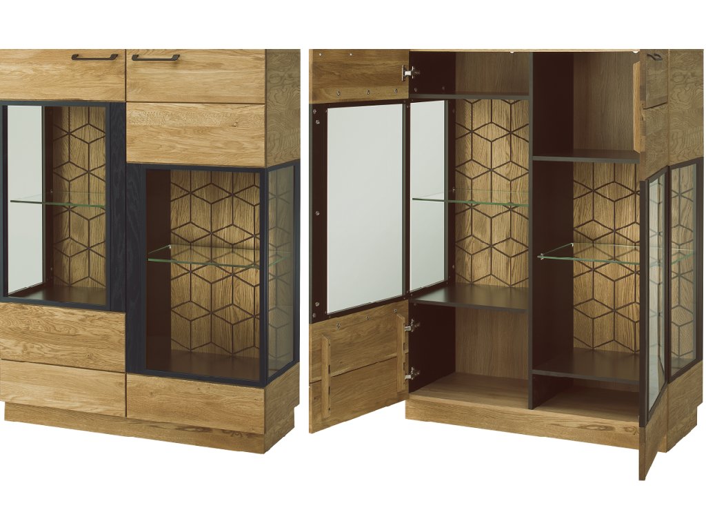 Vitrína MOZAIK vás zaujme svojim elegantným a zároveň luxusným prevedením. Je zo sektoru MOZAIK, vďaka ktorému si poskladáte vašu obývačku podľa predstáv. Je vyrobená z lešteného a olejovaného masívneho dreva. Farebné prevedenie: dub/čierna matná. Úchyty sú v čiernej matnej farbe, vyrobené z kovu. Vitrína je dvojdverová. Vo vnútri sa nachádzajú police. LED osvetlenie nie je súčasťou. Je možné si ho dokúpiť (viď. doporučené produkty). Sektorový nábytok MOZAIK vám ponúka moderný dizajn a kvalitné prevedenie. Prírodná vôňa masívneho dreva a dlhá životnosť nábytku vás presvedčia, že nábytok MOZAIK je to najlepšie riešenie. Nábytok sa ľahko kombinuje s akýmkoľvek interiérom. Vďaka svojmu prevedeniu zútulní vašu obývaciu miestnosť. Výhodou nábytku MOZAIK je, že sa dodáva už zmontovaný. Záruka 24 mesiacov.Dodatočné parametre