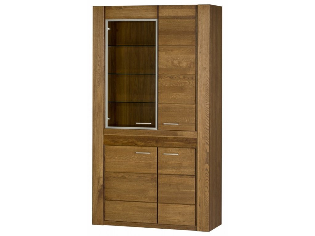 Vitrína V-12 patrí do modernej sektorovej rady VELET. Nábytok je vyrobený z vysoko kvalitných materiálov: korpus je z prírodnej dyhy, predné časti sú z masívneho dreva. Elegantné farebné prevedenie dub rustikálny. Sklo na vitríne je číre. Osvetlenie vo vnútri vitríny nie je v cene, je možné ho dokúpiť. Horizontálne osvetlenie zabudované do drevenej časti nábytku je v štandarde. Rozmer š/v/h 110 x 200 x 42 cm. Dodávame v zmontované. V sektore VELET sa nachádza 15 rôznych elementov, z ktorých je možné zariadiť si originálnu jedáleň či obývačku.Dodatočné parametre