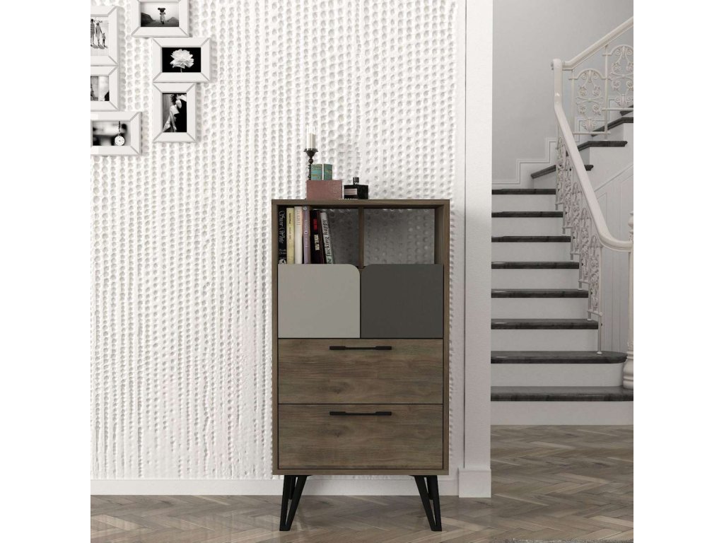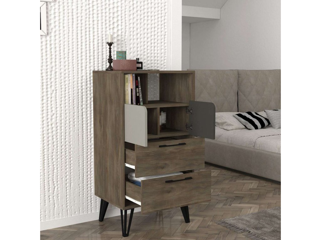 Komoda BRUGES sa vyznačuje moderným prevedením v elegantnej kombinácii šedej, béžovej a antracitovej farby, ktorá ľahko zapadne do akéhokoľvek interiéru. Vysoký vzhľad komody poskytuje dostatok úložného priestoru vďaka dvom zásuvkám, skrinke a regálku, čo vám umožní efektívne usporiadať všetky vaše veci.