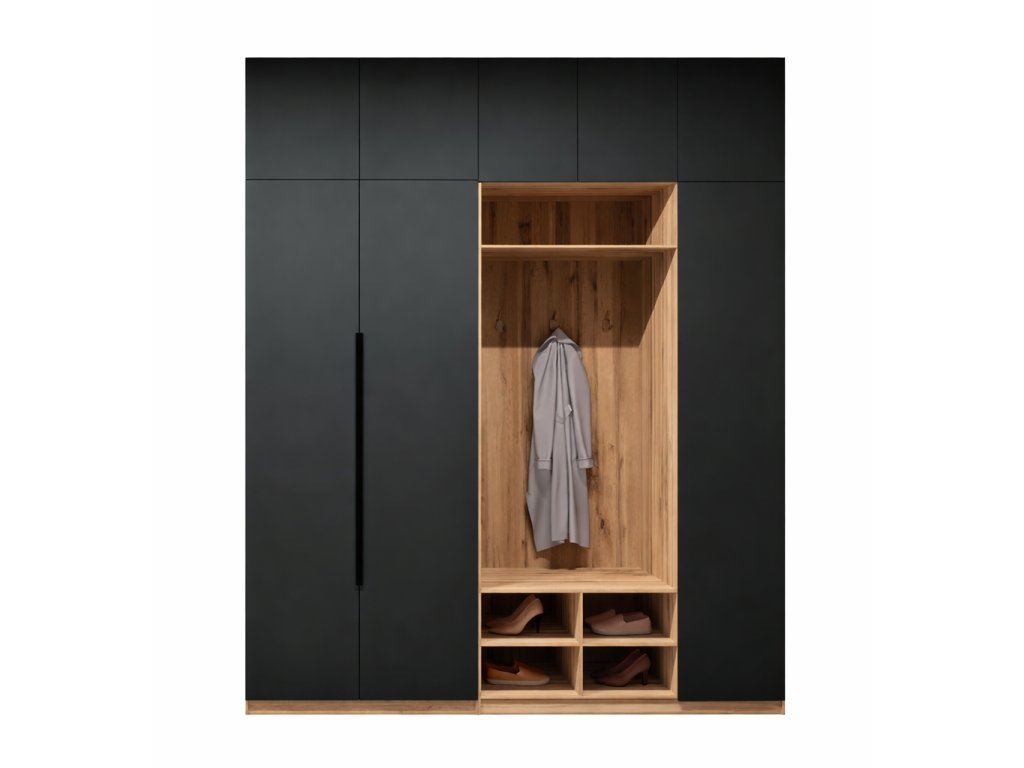 | Zostava obsahuje: | štvordverová šatníková skriňa š.90 x h.55 x v.260cm, vešiaková stena s botníkom skríň š.125 x h.55 x v.260cm |