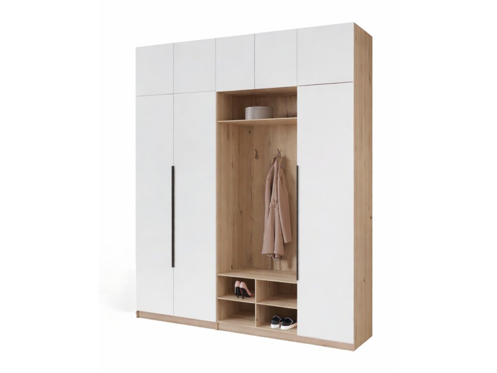 | Zostava obsahuje: | štvordverová šatníková skriňa š.90 x h.55 x v.260cm, vešiaková stena s botníkom skríň š.125 x h.55 x v.260cm |