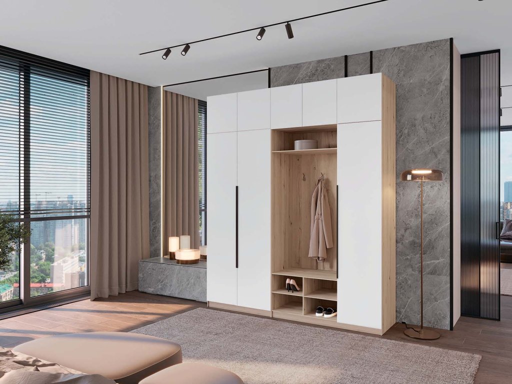 Predsieňová zostava GLAMOUR je moderné a praktické riešenie pre každú domácnosť. Elegantná kombinácia bielej farby a dubu pôsobí nadčasovo a ľahko sa prispôsobí rôznym interiérom. Vďaka vysokému prevedeniu až 260 cm ponúka veľkorysý úložný priestor aj v menšej predsieni.