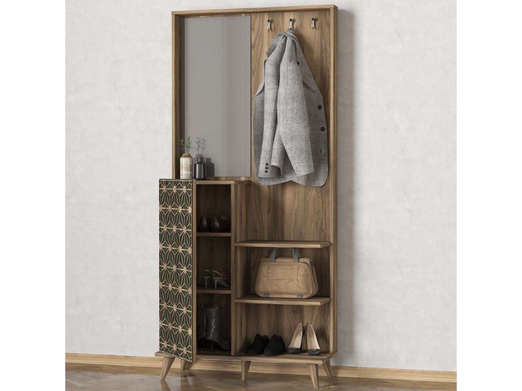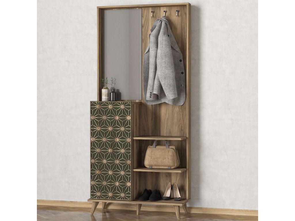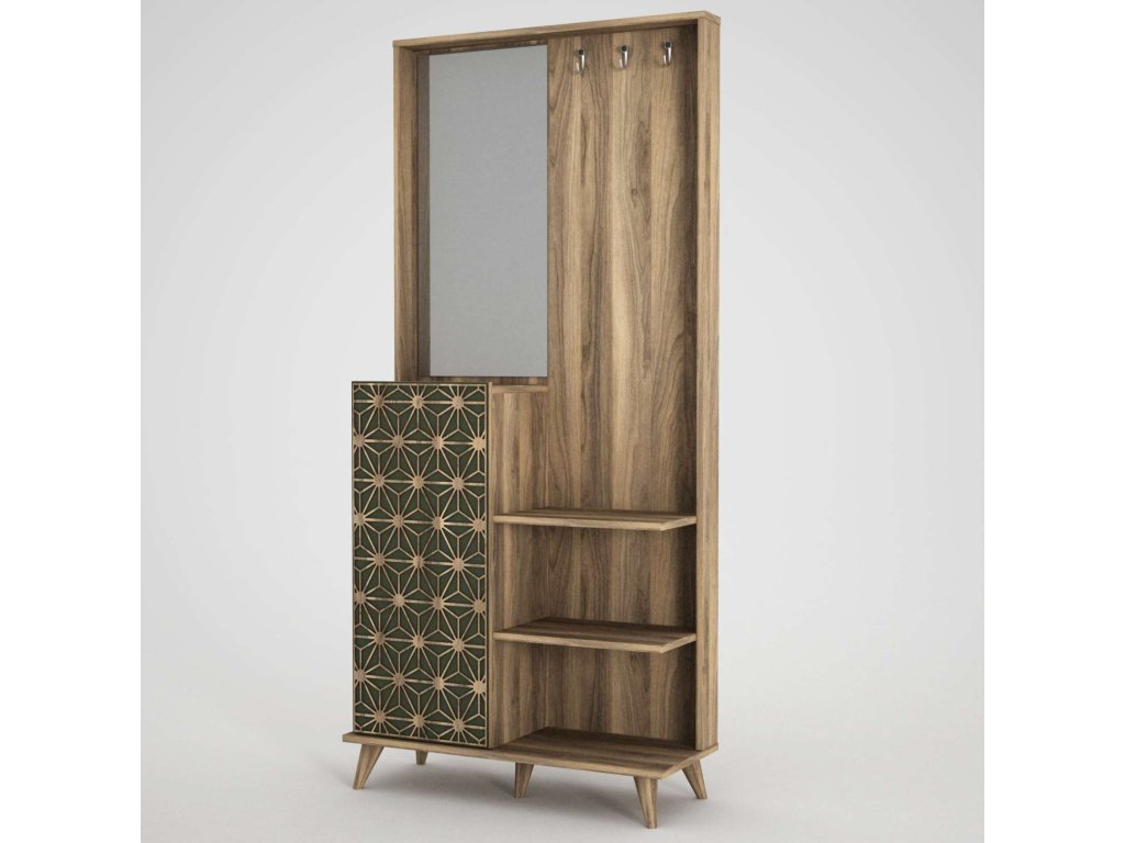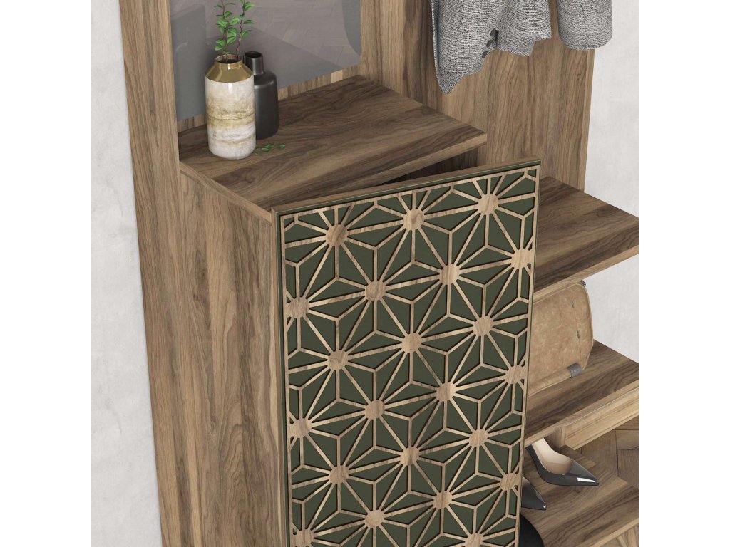 Predsiňová zostava STRESS ponúka kombináciu skríň, šatníka, vešiakov a veľkého zrkadla, čo zaisťuje dostatok úložného priestoru pre všetky vaše potreby. Vyrobená z kvalitných materiálov LTD a skla s hrúbkou 18 mm, zaručuje dlhú životnosť a odolnosť. Farba orecha a orientálny dizajn dodávajú zostave jedinečný a luxusný vzhľad, ktorý sa ľahko stane ústredným bodom vašej predsiene.