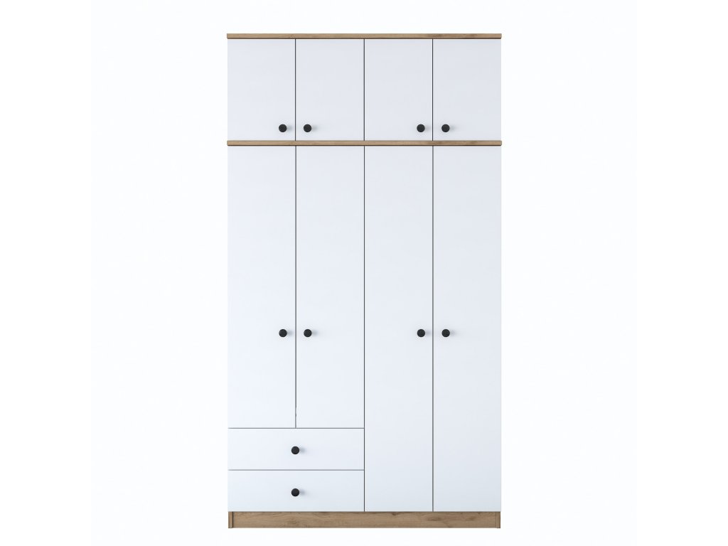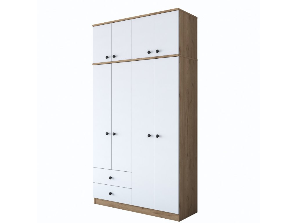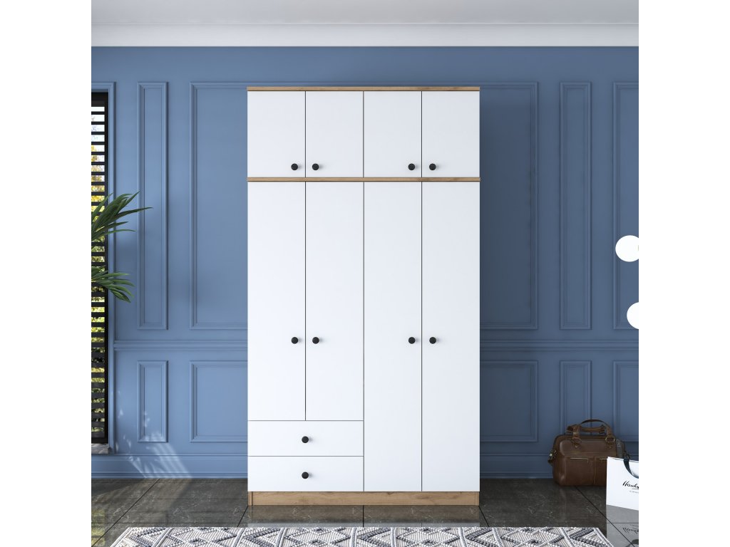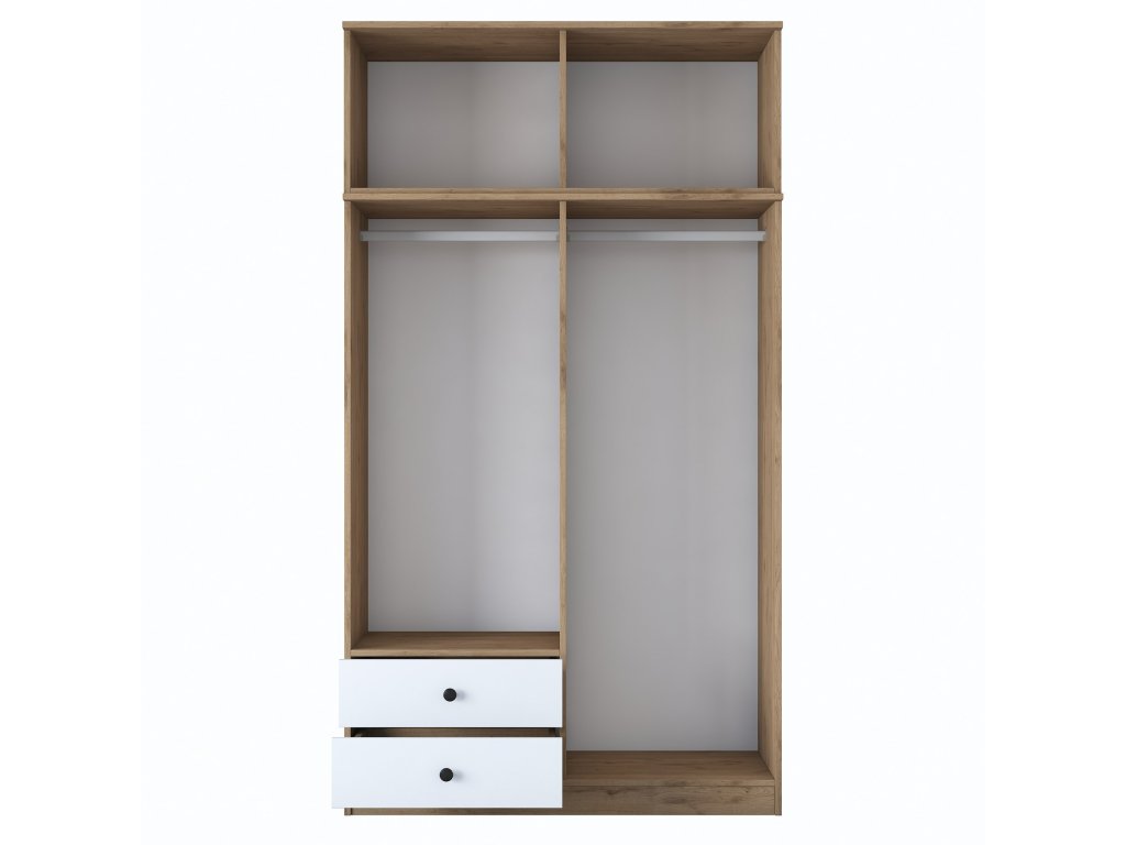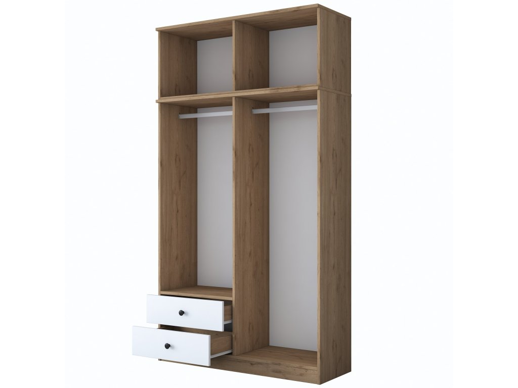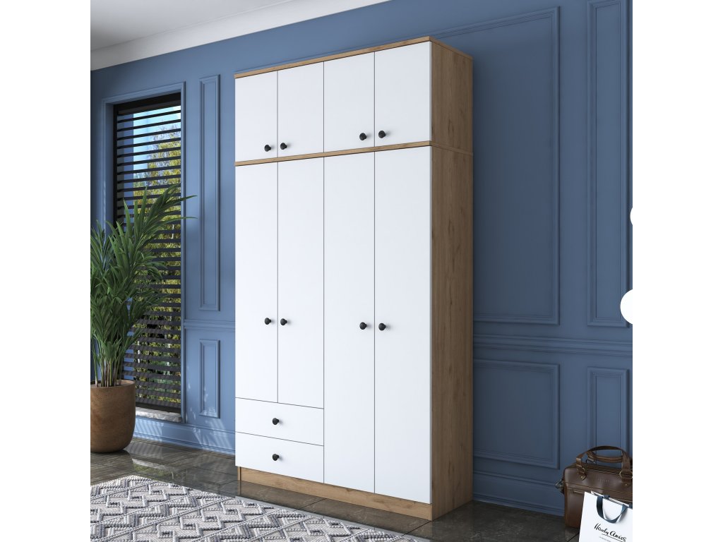 Šatníková skriňa BRAIN je ideálnym riešením pre usporiadanie vášho oblečenia a doplnkov v spálni alebo predsieni. Spojenie bielej farby s dekorom orecha prináša do interiéru moderný a útulný vzhľad. Vďaka vysokej konštrukcii a praktickému usporiadaniu ponúka dostatok úložného priestoru pre všetky vaše potreby.