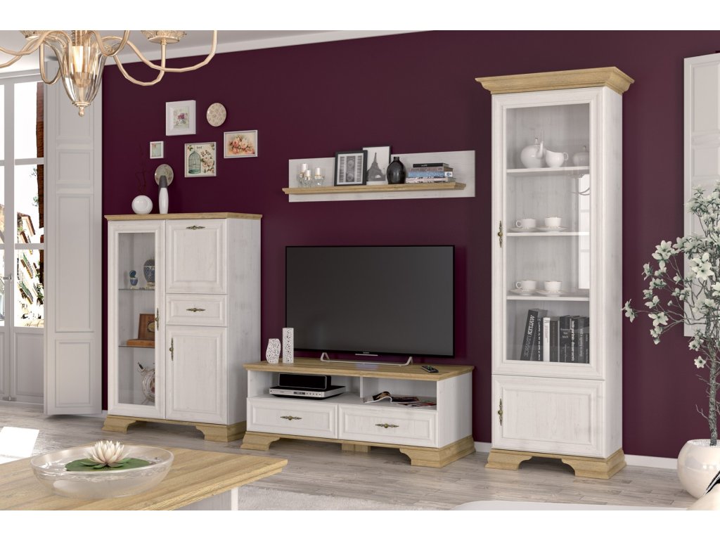 JARMANKA je sektorový prvok s rustikálnym nádychom. Jeho štýlové prevedenie je podfarbené kombináciou kontrasných farieb borovice anderson a dub zlatý. Svetlé farby rozjasnia priestor a opticky ho zväčšia. Efektné úchyty s ornamentom v zlatom farebnom prevedení, dodávajú nábytku šmrnc a eleganciu. Elegantné oblé hrany nájdete ako na štýlovom prevedení nožičiek tak aj na dvierkach a hornej zakončovacej lište.