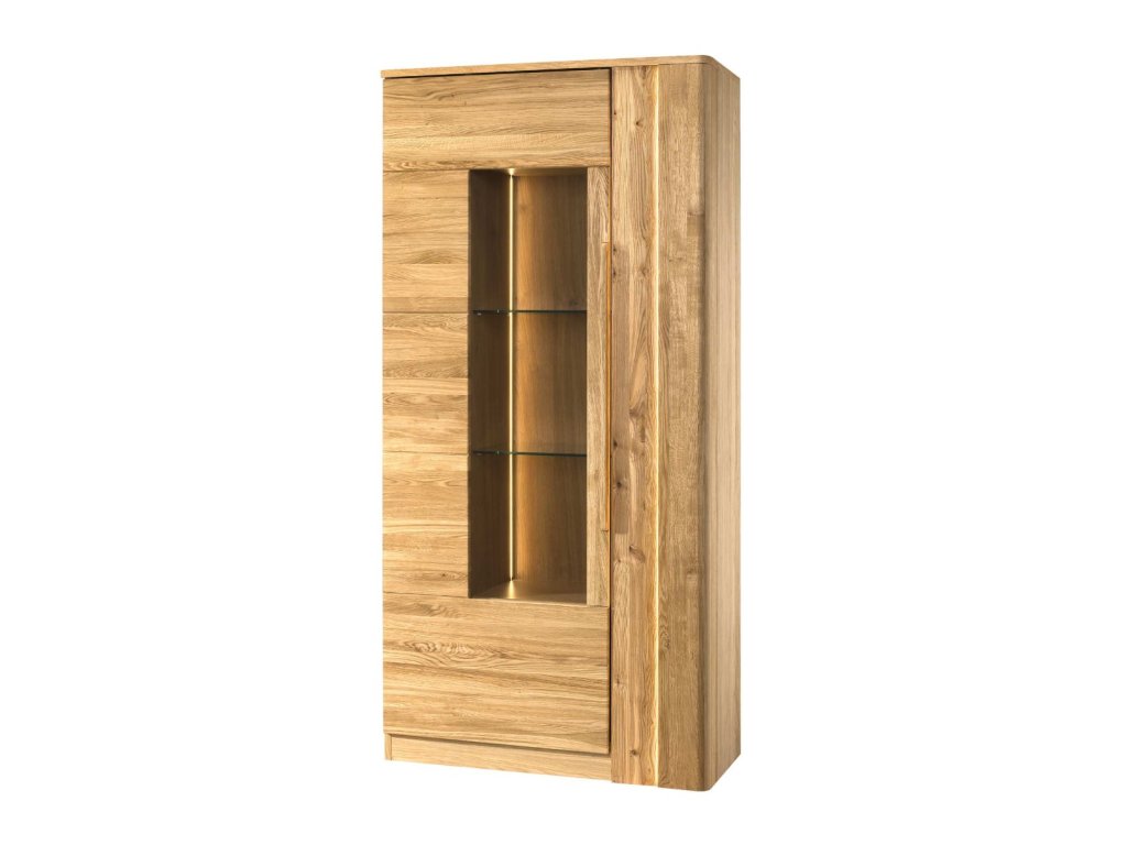 Vitrína je vysoká, presklená. Police sú vyrobené z číreho tvrdeného skla. Farebné prevedenie: dub Natura.