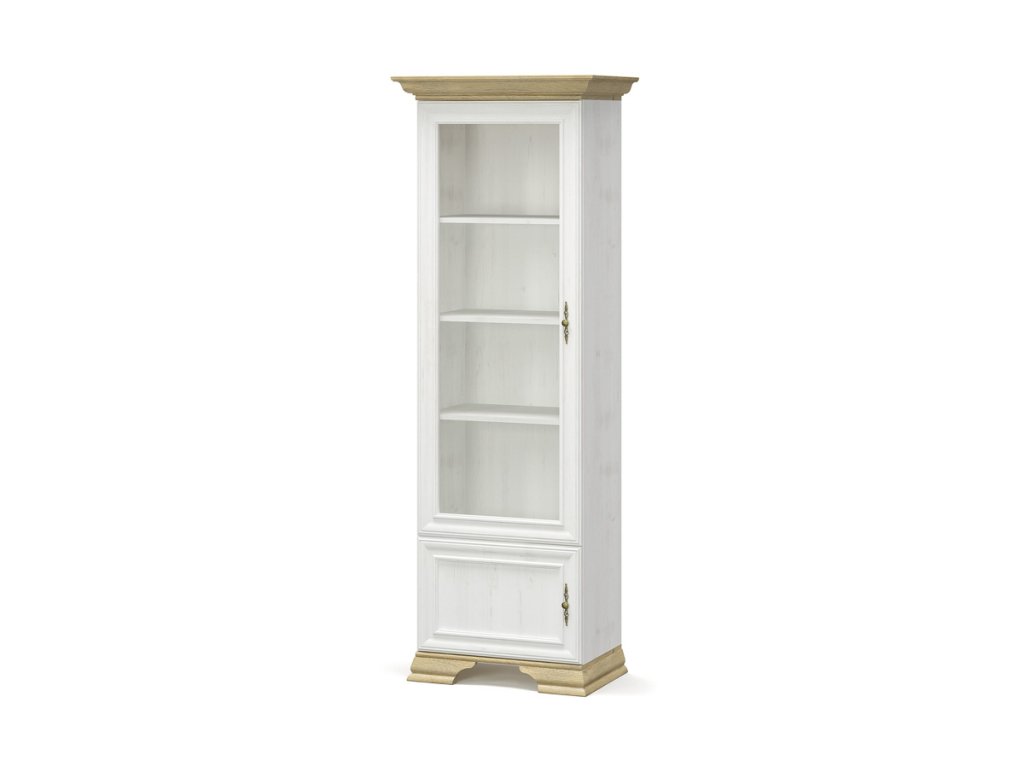 JARMANKA je sektorový prvok s rustikálnym nádychom. Jeho štýlové prevedenie je podfarbené kombináciou kontrasných farieb borovice anderson a dub zlatý. Svetlé farby rozjasnia priestor a opticky ho zväčšia. Efektné úchyty s ornamentom v zlatom farebnom prevedení dodávajú nábytku šmrnc a eleganciu. Elegantné oblé hrany nájdete ako na štýlovom prevedení nožičiek tak aj na dvierkach a hornej zakončovacej lište. Vysoká vitrína ponúka v hornej časti presklenú časť s 3 vnútornými poličkami. Je vhodná na umiestnenie pohárov či dekoračných predmetov. V spodnej časti nájdete za otváracími dvierkami menší úložný priestor. Rozmery (š/v/h): 70,3 x 197,6 x 43 cm. V našej ponuke nájdete aj ďalšie prvky sektora JARMANKA, z ktorých si viete poskladať štýlovú obývaciu izbu. Dodávame v demonte.Dodatočné parametre