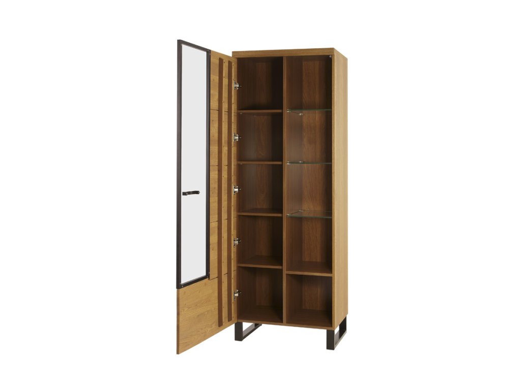 Vitrína je jednodverová. Otvára sa do ľavej strany. Vo vnútri sa nachádza 8 políc, z toho tri sú sklenené. LED osvetlenie nie je v cene vitríny. Je možné si ho dokúpiť.