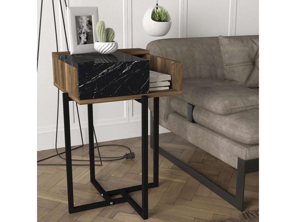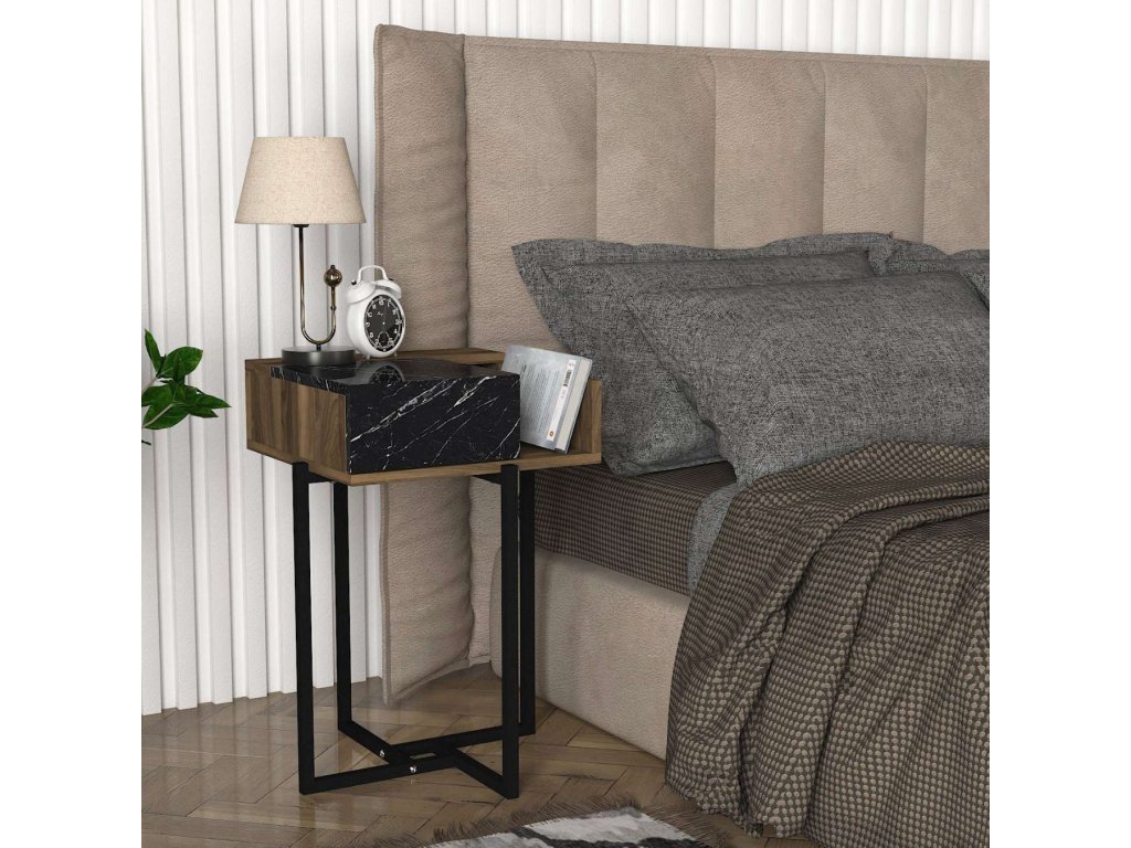 Nočný stolík MAGMA sa pýši elegantným orechovým prevedením, doplneným o štýlové mramorové detaily a kovové prvky, ktoré spoločne vytvárajú moderný industriálny vzhľad. Vďaka skrinke a odkladacej polici ponúka tento stolík dostatok úložného priestoru pre vaše knihy, časopisy či ďalšie nevyhnutnosti, ktoré chcete mať po ruke.