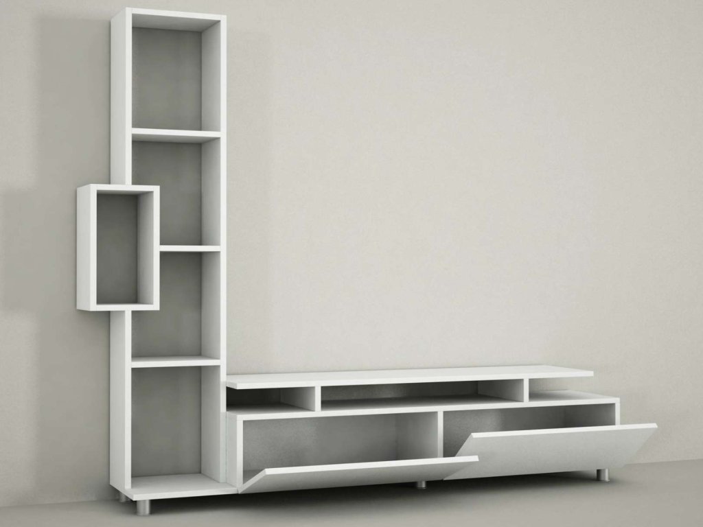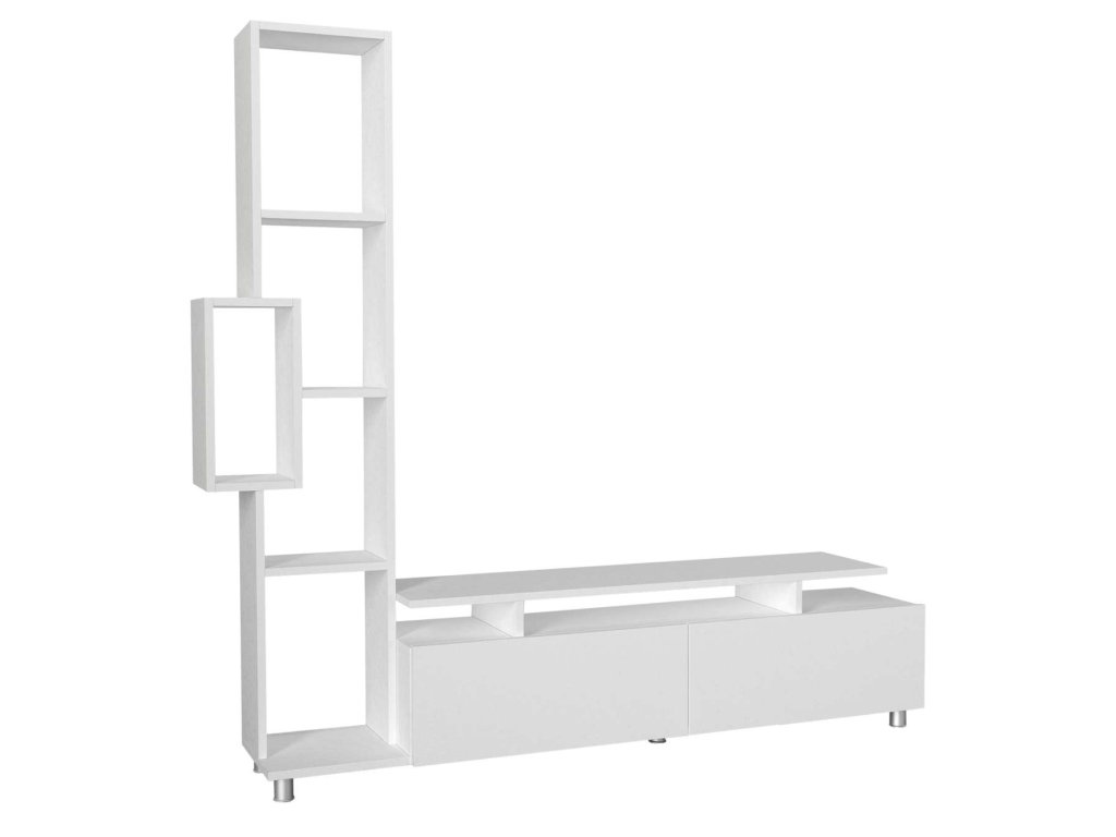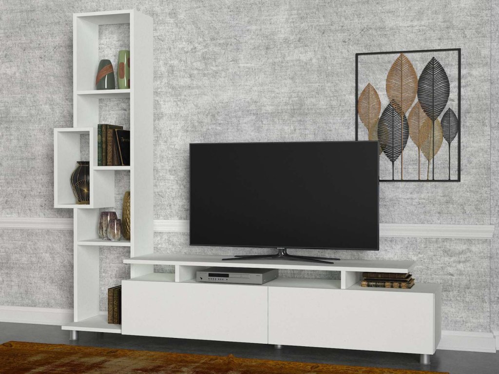 - Vybavenie: Obsahuje regál a dve skrinky, ktoré ponúkajú bohatý úložný priestor pre elektroniku, knihy a ďalšie dekorácie.