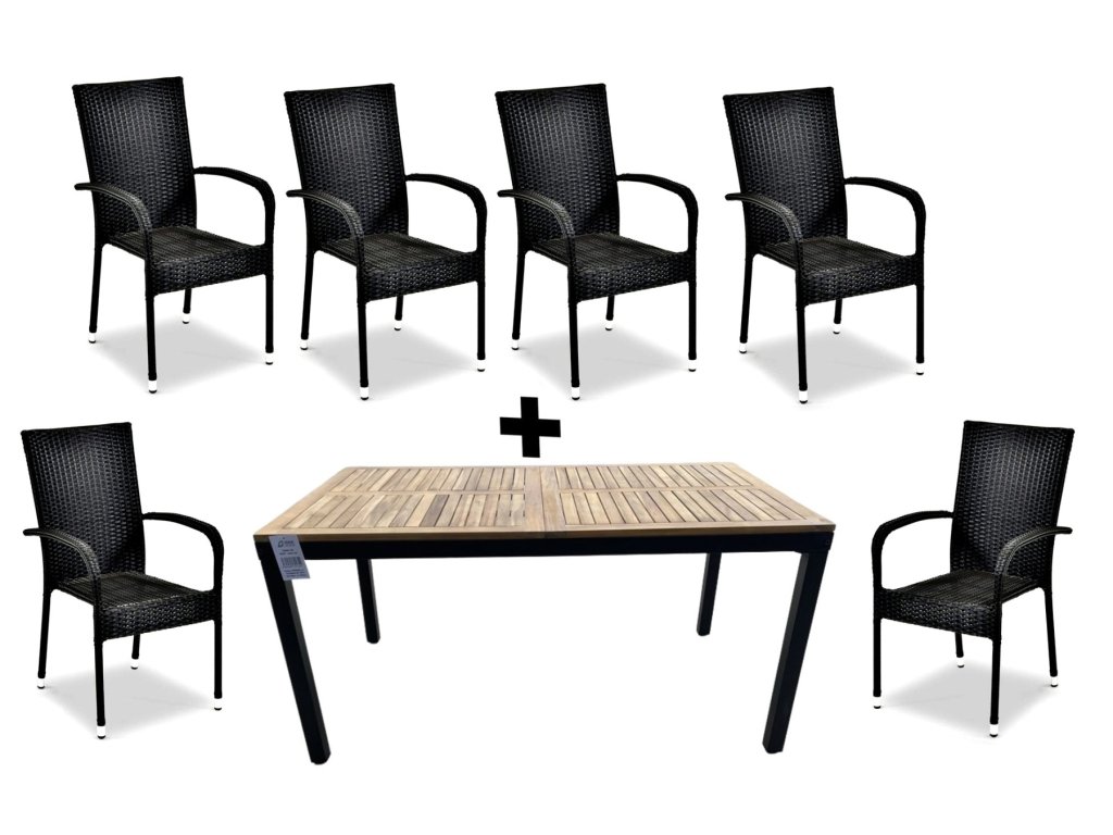 Štýlová záhradná zostava MATIAS 6+1 sa skvele hodí na balkón, terasu aj záhradu. Doska stola je zhotovená z kvalitného masívneho dreva akácie. Naturálny drevený dekor vrchnej dosky spolu s čiernou kovovou konštrukciou spolu tvoria výnimočný dizajnový kúsok Vašej záhrady či terasy. Vďaka výrobe z poctivého materiálu je stôl mimoriadne odolný. (reálne foto dosky stola je na obr. č.2)
