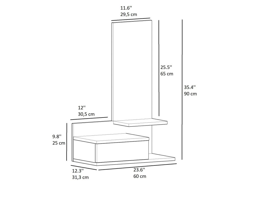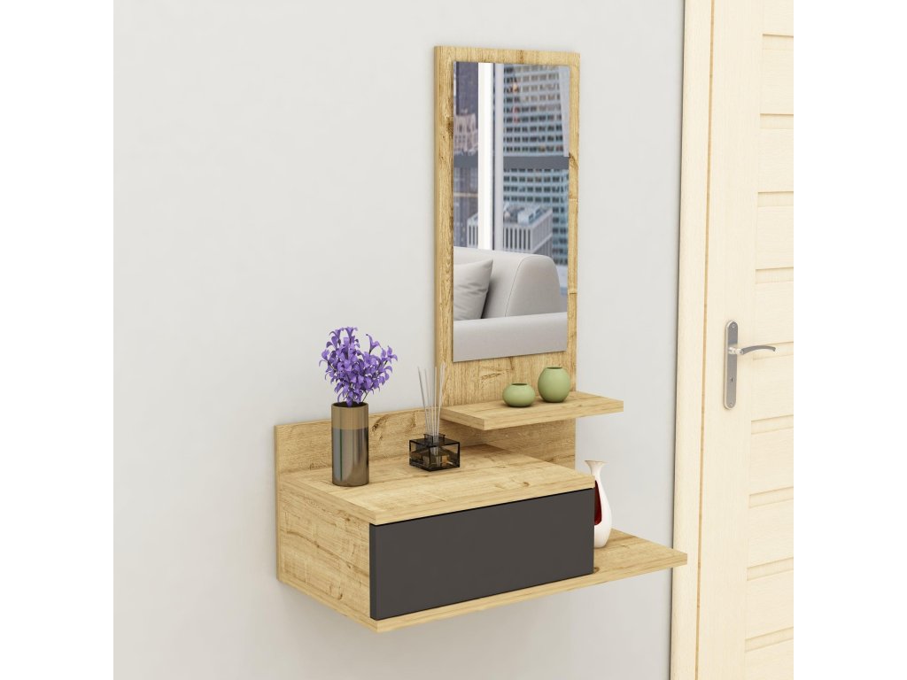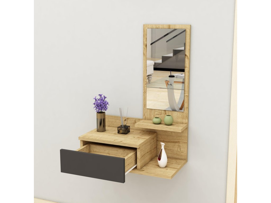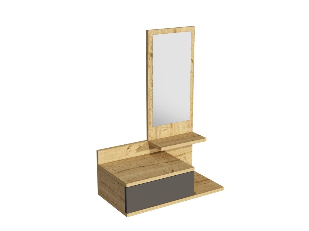 Stolík AUSTIN je navrhnutý pre moderné predsiene, kde je kľúčové efektívne využitie priestoru a estetika. Tento závesný odkladací stolík ponúka praktické vybavenie v podobe zásuvky, odkladacej police a integrovaného zrkadla, ktoré vám uľahčia každodennú organizáciu a pridá štýl vášmu interiéru.