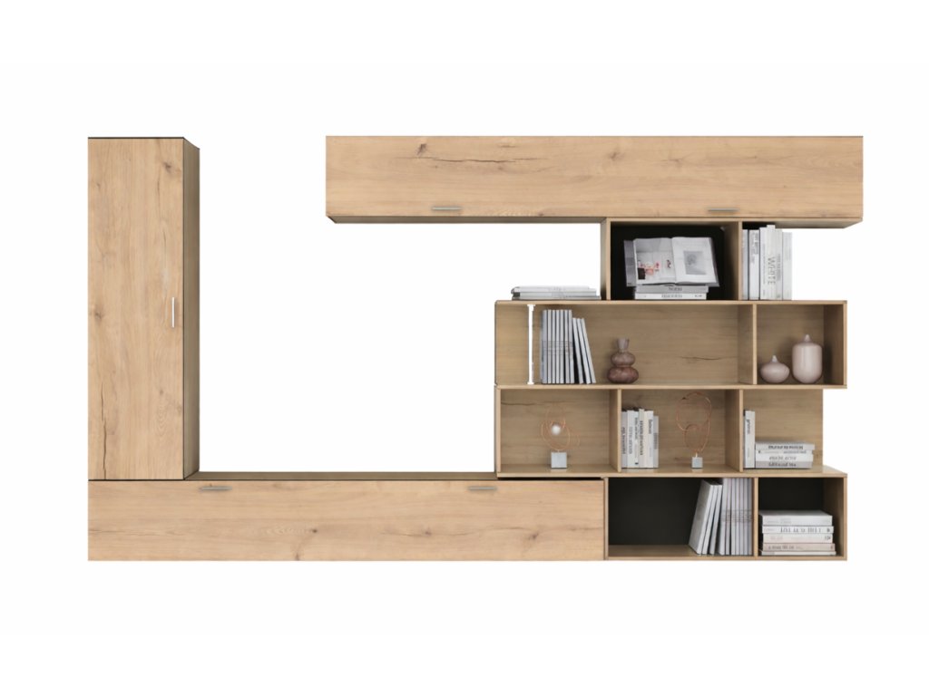 Zostava obsahuje tri skrinky a praktický regál, ktoré poskytujú dostatok priestoru na uloženie elektroniky, kníh, dekorácií aj ďalších doplnkov. Obývacia stena RATED tak ponúka ideálnu rovnováhu medzi funkčnosťou a moderným dizajnom.