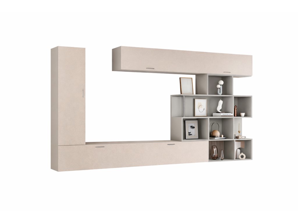Premyslené usporiadanie zahŕňa tri skrinky a praktický regál, ktoré umožňujú prehľadné uloženie elektroniky, dekorácií aj každodenných doplnkov. Obývacia stena RATEM tak spája estetiku s praktickým využitím.