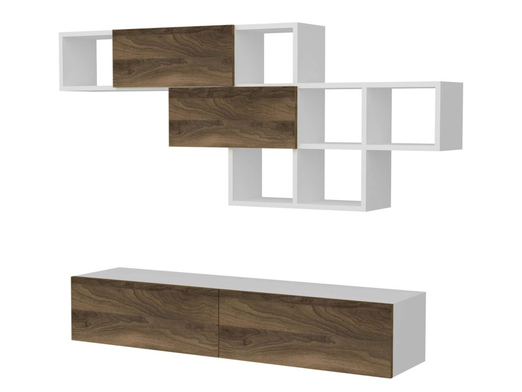 - Vybavenie: Závesný TV stolík a nástenný modul, ktoré poskytujú bohatý úložný priestor a zároveň slúžia ako estetický prvok vašej obývačky.
