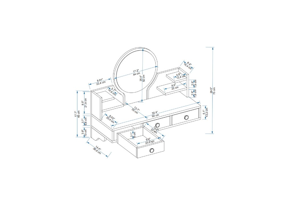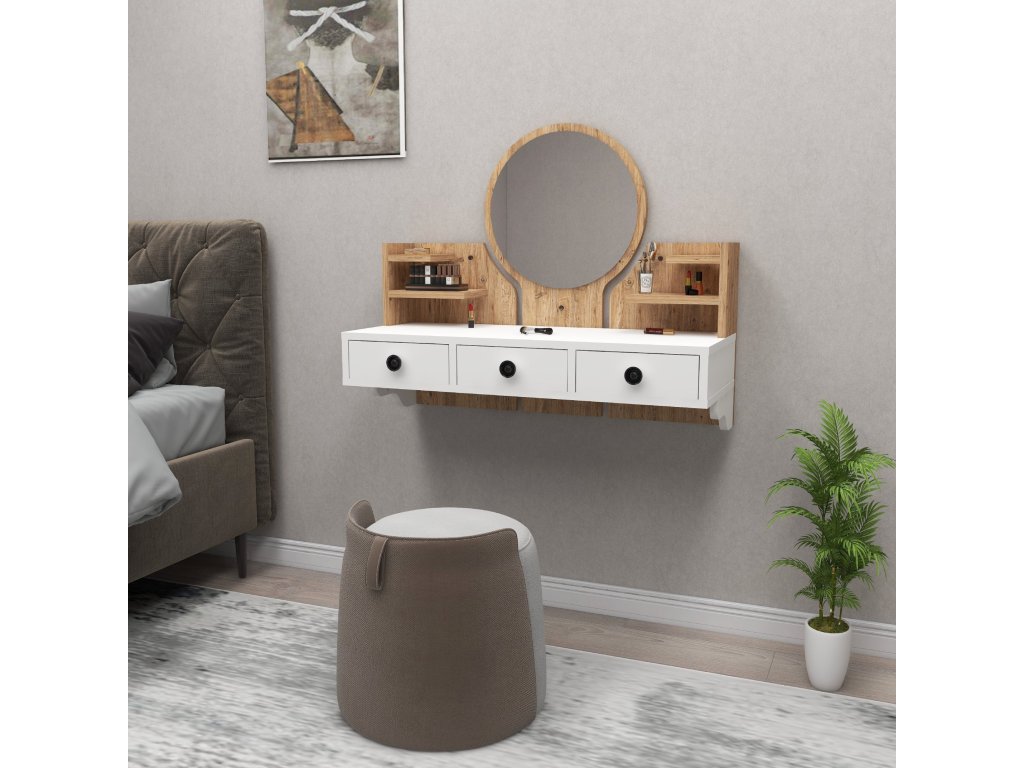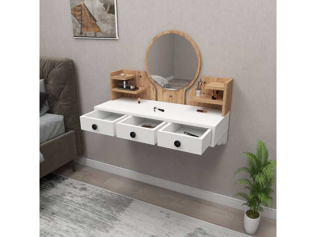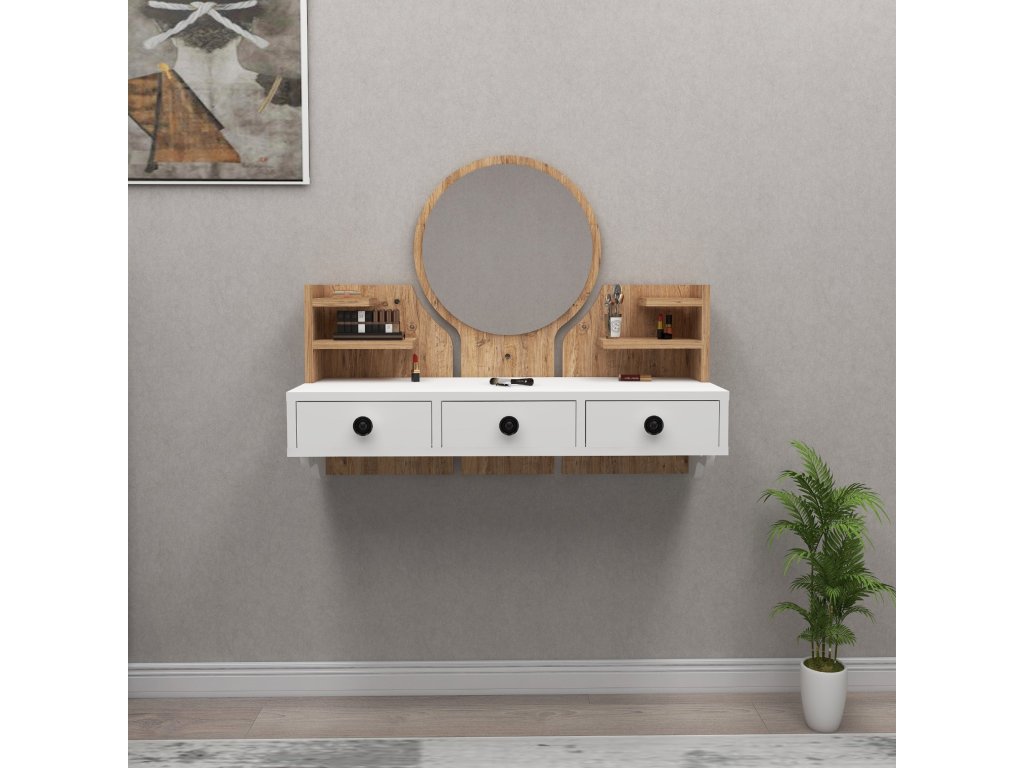 Toaletný stolík VERMONT prináša kúzlo vintage a retro štýlu do vášho interiéru. Tento závesný stolík ponúka praktické vybavenie v podobe troch zásuviek, regálku a zrkadla, čo z neho robí perfektnú voľbu pre každodennú starostlivosť. Jeho elegantný dizajn a úsporný závesný systém šetrí miesto a zároveň dodáva spálni jedinečný štýl.