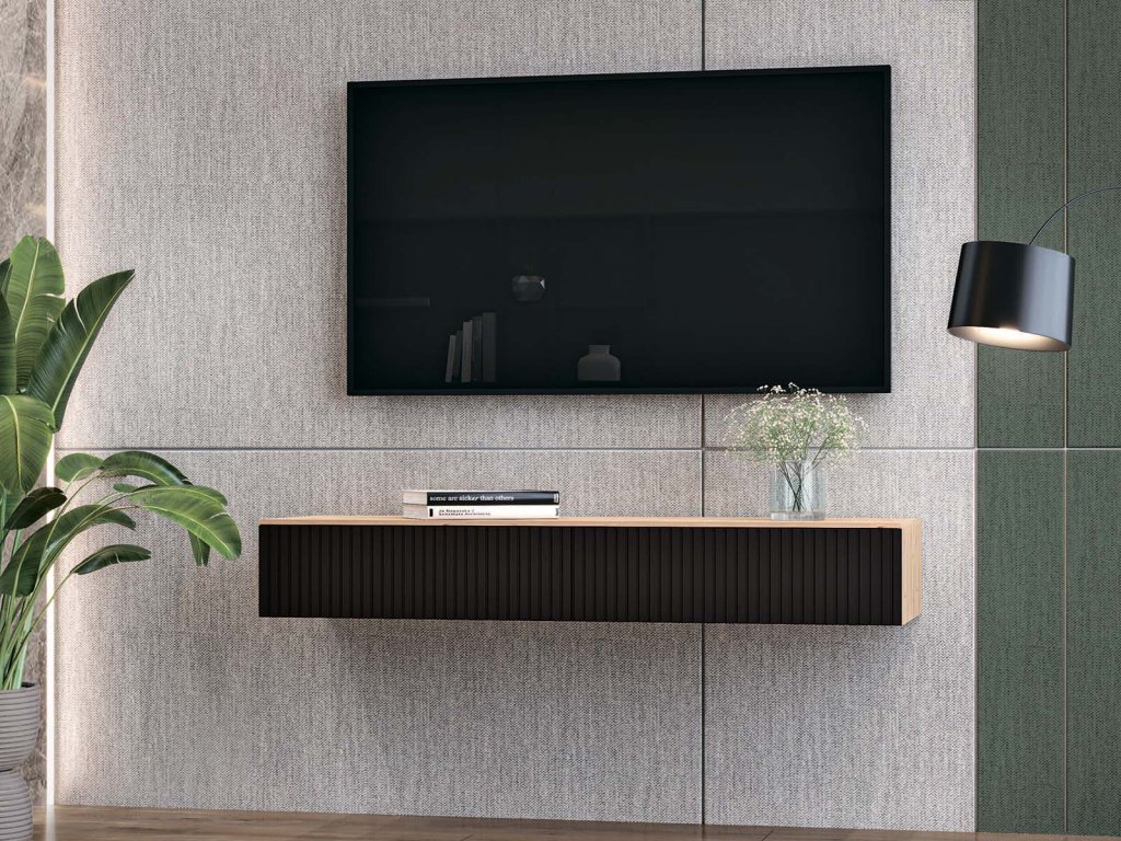 Závesný TV stolík DUBLIN 1 je štýlovým riešením pre moderné obývacie izby, kde je kladený dôraz na čistý dizajn a praktické využitie priestoru. Vďaka závesnému prevedeniu pôsobí interiér vzdušne a usporiadane.