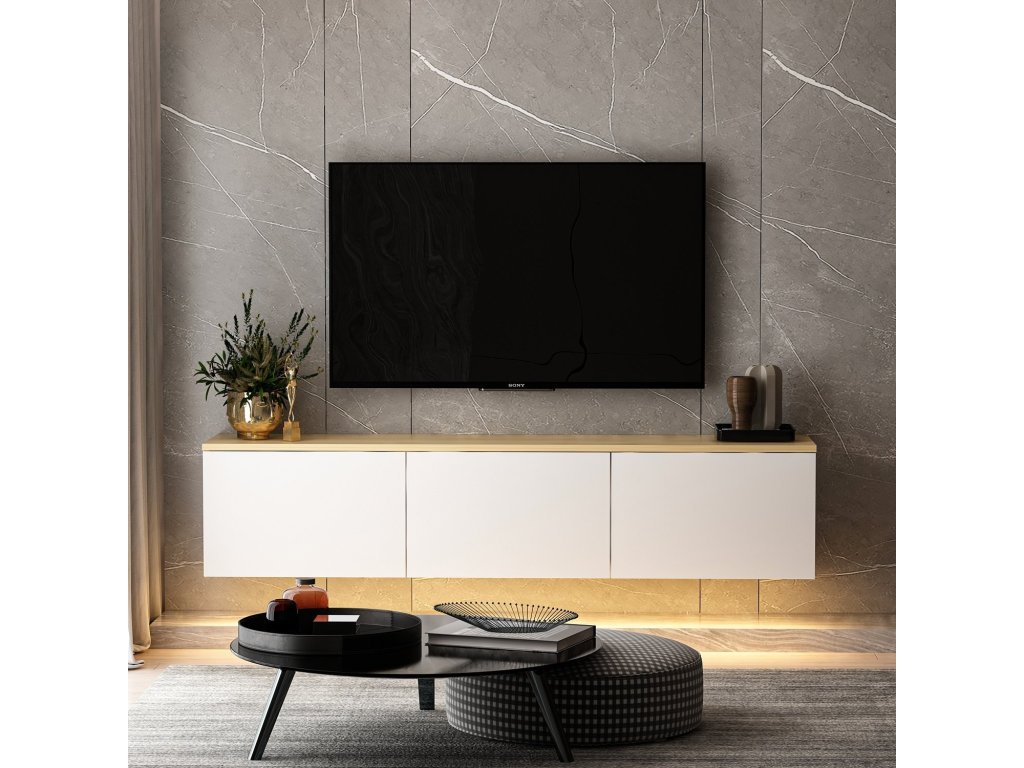Závesný TV stolík s LED osvetlením SIMA, biela / dub