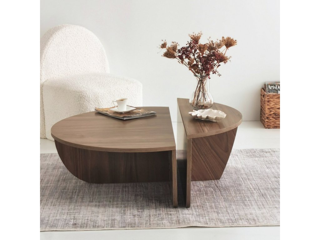 Stolík STEWIE je navrhnutý s ohľadom na praktickosť a moderný štýl. Jeho zložiteľný dizajn umožňuje ľahké skladovanie a flexibilné použitie, čo oceníte v menších aj väčších priestoroch. Atypický tvar a povrch v dekore orech dodávajú interiéru jedinečný a elegantný vzhľad.