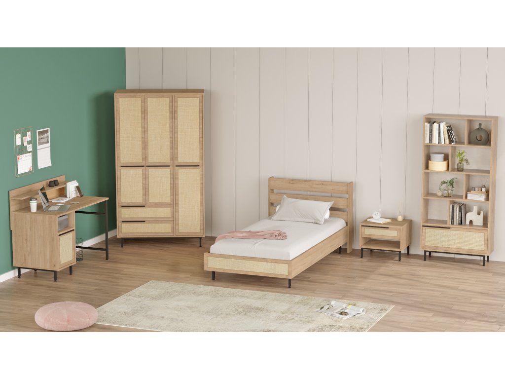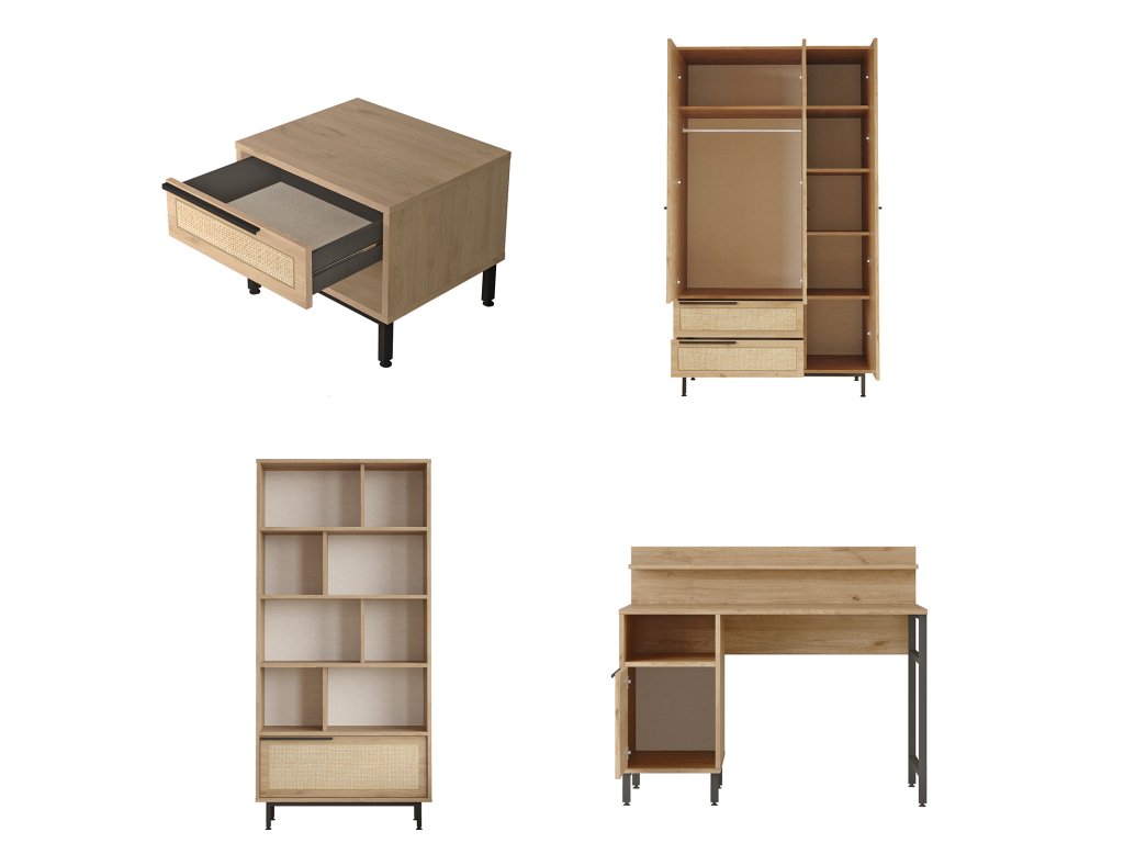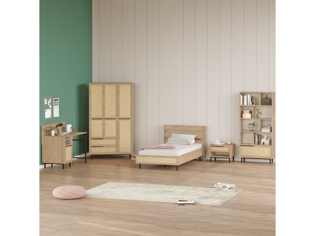 | Zostava obsahuje: | jednolôžková posteľ 205,6x108,5x86cm, nočný stolík 53,6x44,5x42,4cm, šatníková skriňa 112,2x55x195,6cm, písací stôl 120x60x99,8cm, knižnica 83, |