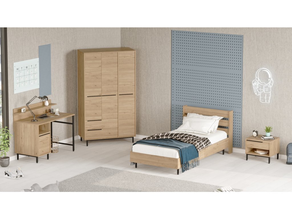 | Zostava obsahuje: | jednolôžková posteľ 205,6x108,5x86cm, nočný stolík 53,6x44,5x42,4cm, šatníková skriňa 112,2x55x195,6cm, písací stôl 120x60x99,8cm |