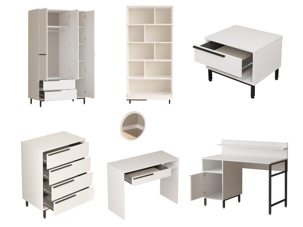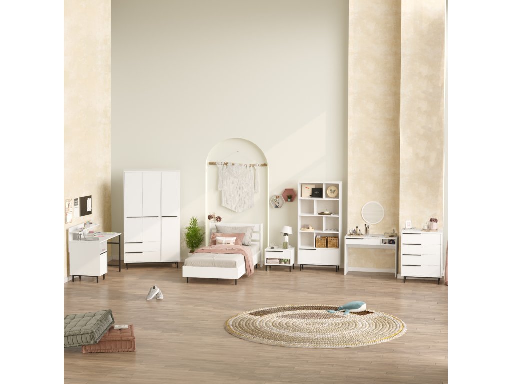 | Zostava obsahuje: | jednolôžková posteľ 205,6x108,5x86cm, nočný stolík 53,6x44,5x42,4cm, šatníková skriňa 112,2x55x195,6cm, písací stôl 120x60x99,8cm, knižnica 83, 74,8x44,5x95,1cm, toaletný stolík 100x44,5x75cm |