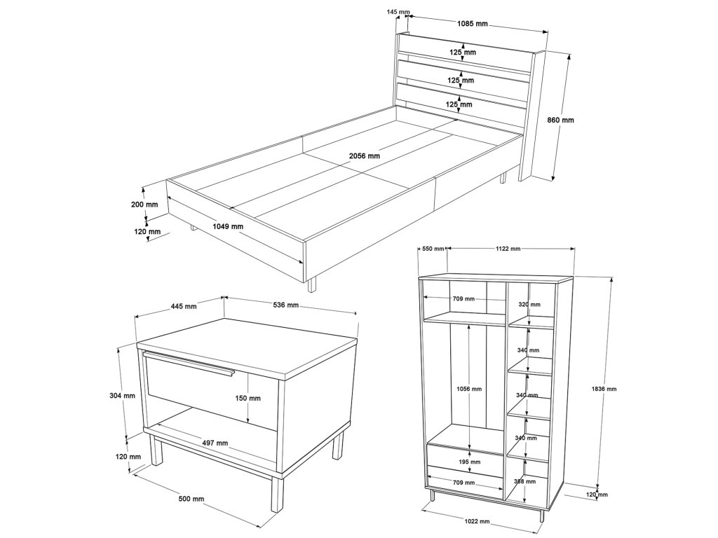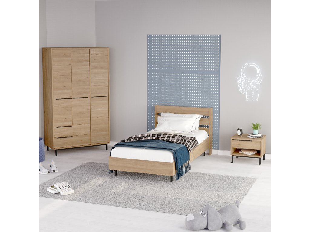 | Zostava obsahuje: | jednolôžková posteľ 205,6x108,5x86cm, nočný stolík 53,6x44,5x42,4cm, šatníková skriňa 112,2x55x195,6cm |