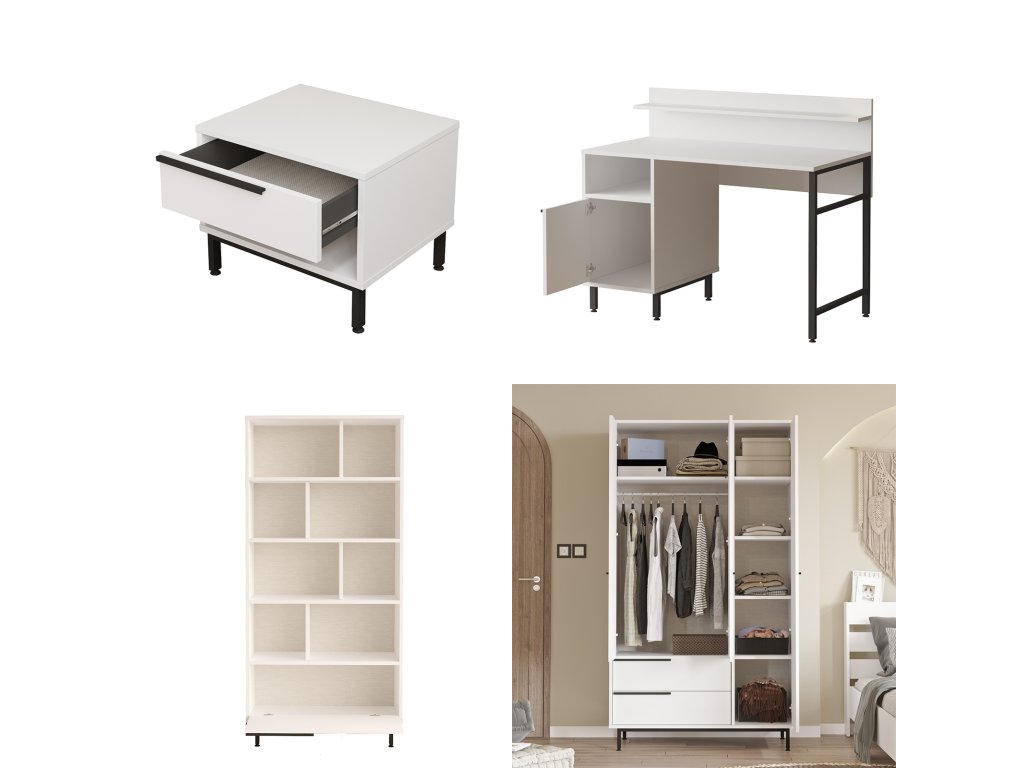| Zostava obsahuje: | jednolôžková posteľ 205,6x108,5x86cm, nočný stolík 53,6x44,5x42,4cm, šatníková skriňa 112,2x55x195,6cm, písací stôl 120x60x99,8cm, knižnica 83, 74,8x44,5x95,1cm |